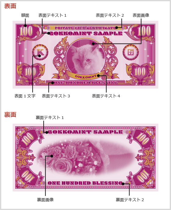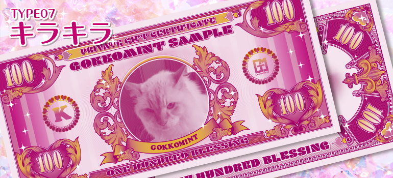 デザインフォーマットの種類-Type07 デザインフォーマットの種類 TYPE07 キラキラ キラキラのカワイイ系紙幣です。 ※TYPE07 キラキラは不定期でデザインのバージョンアップをしていきます。 TYPE07 キラキラ カスタマイズ可能箇所 [表面] ●額面 ●表面テキスト1 ●表面テキスト2 ●表面テキスト3 ●表面テキスト4 ●表面1文字 ●表面画像 [裏面] ●裏面テキスト1 ●裏面テキスト2 ●裏面画像